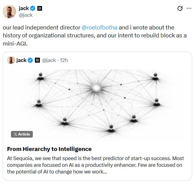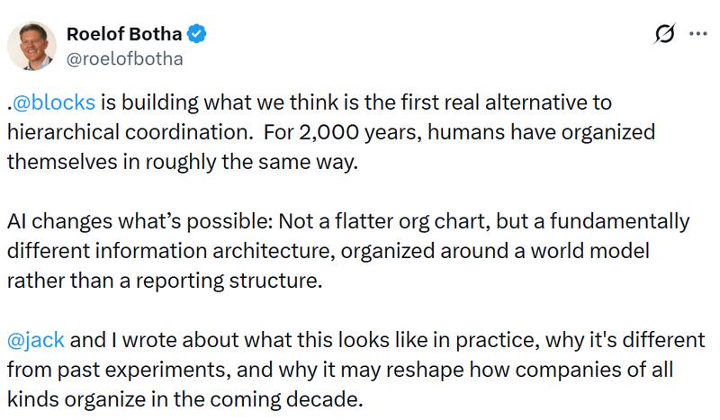 "We believe the pattern behind this, a company organized as an intelligence rather than a hierarchy, is significant enough that it will reshape how companies of all kinds operate over the coming years," Dorsey and Botha said.