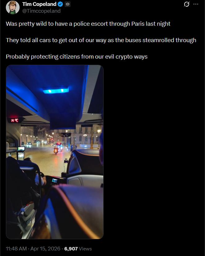During Paris Blockchain Week, law enforcement maintained a substantial visible presence. In a message posted on X, Tim Copeland, The Block's head of growth, mentioned that certain conference participants received police escort services while traveling through Paris.